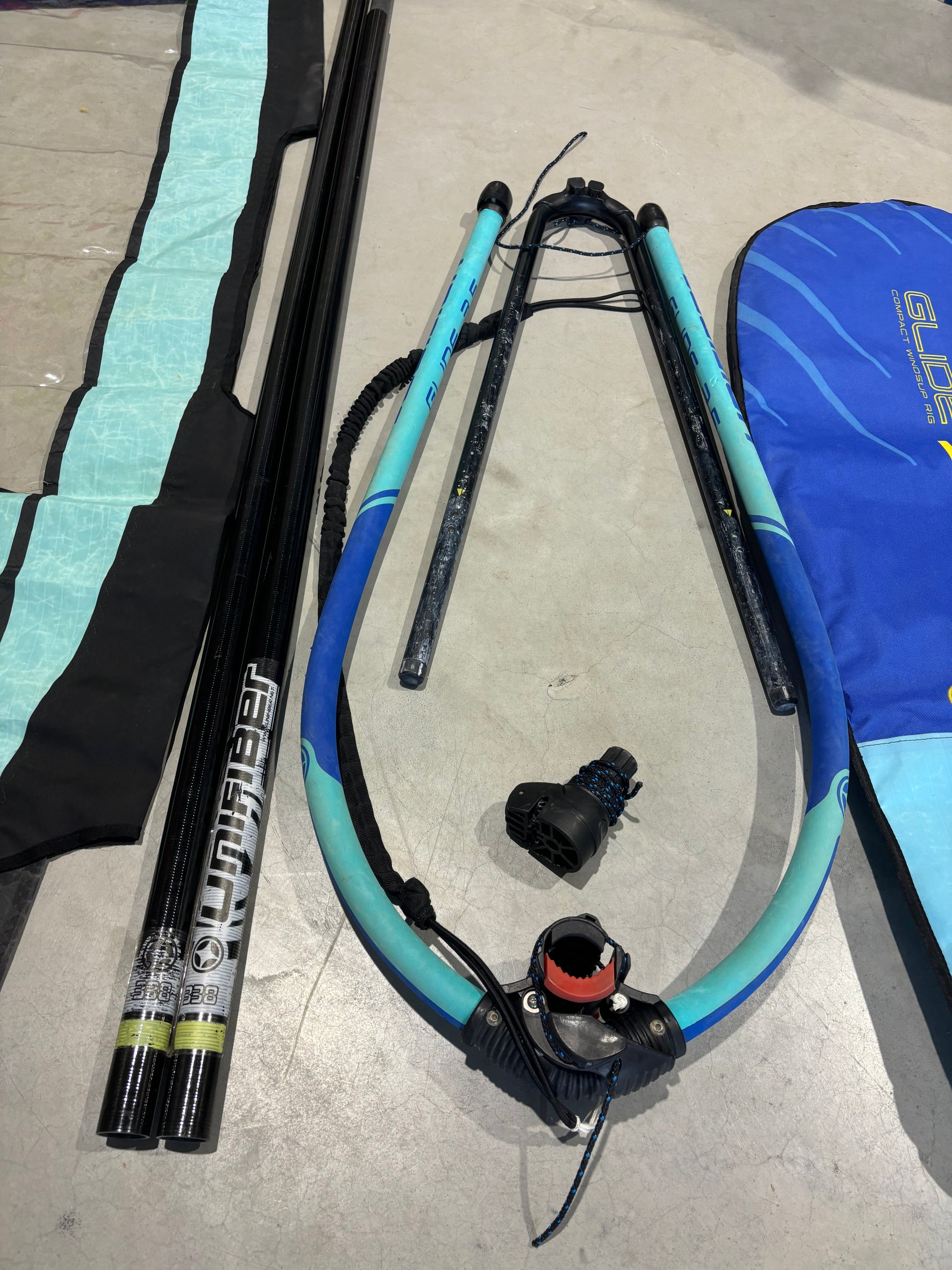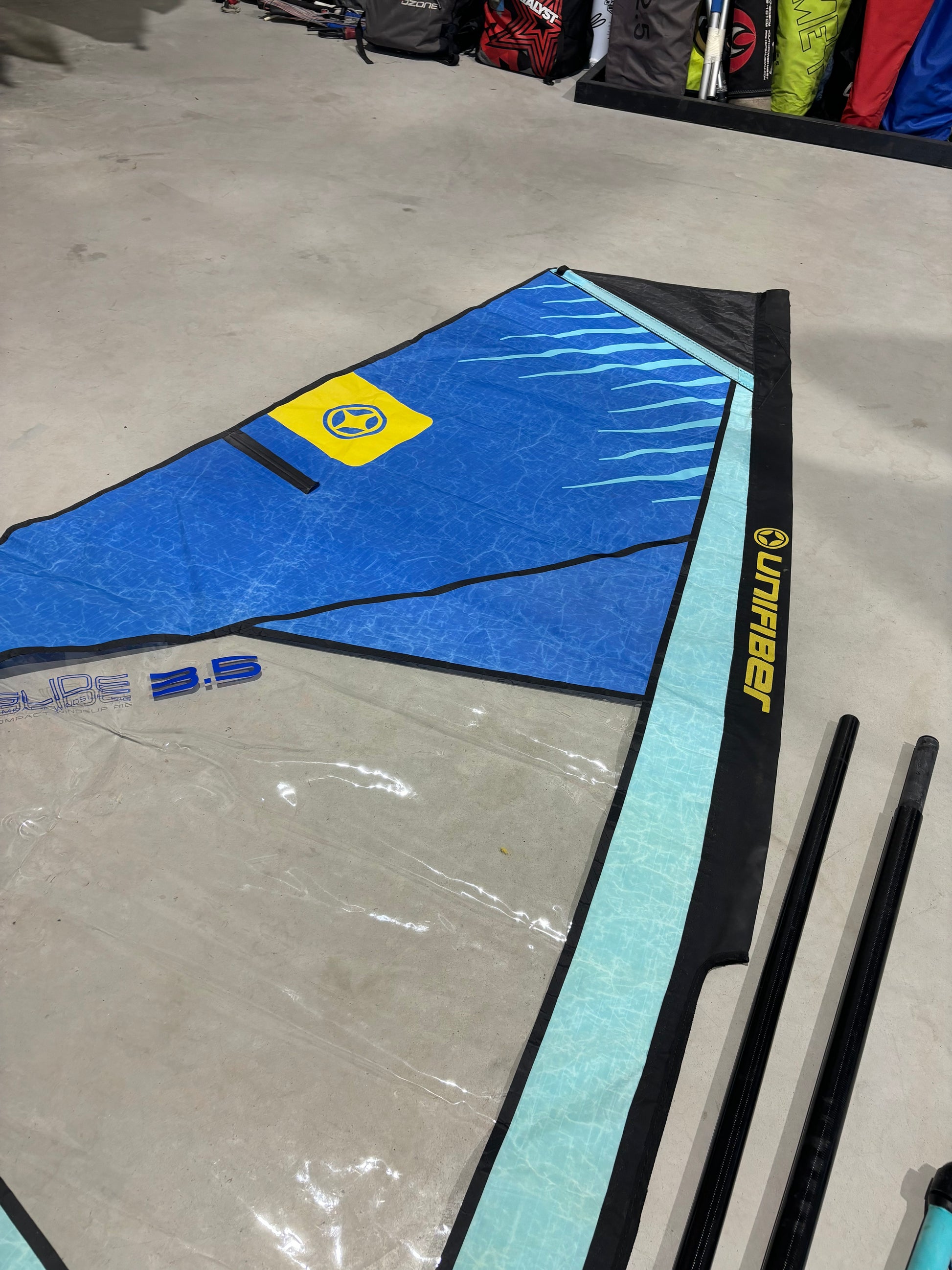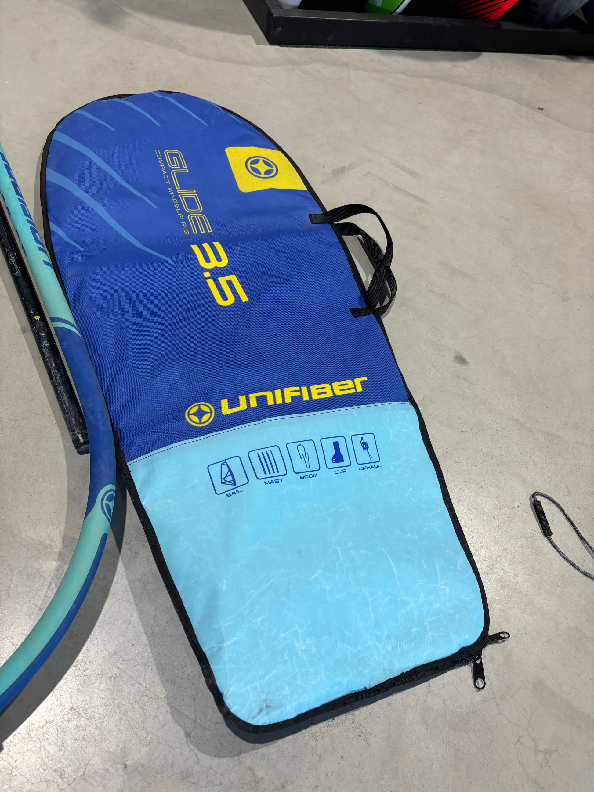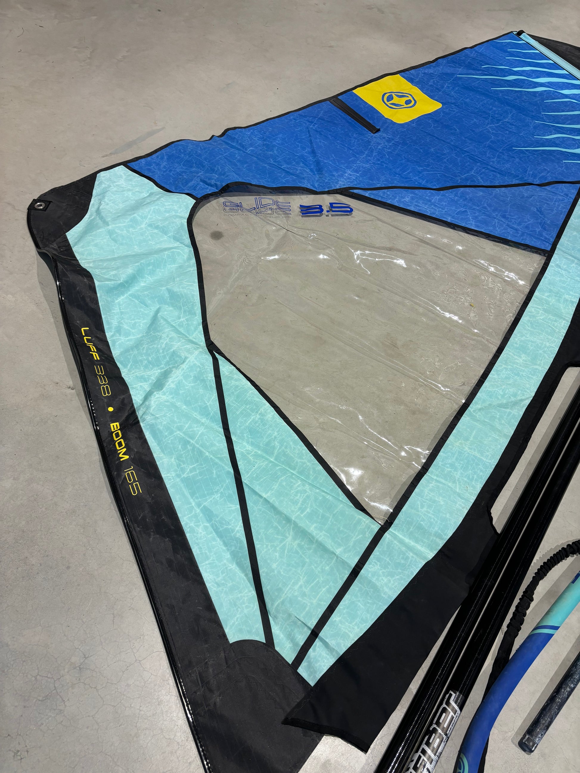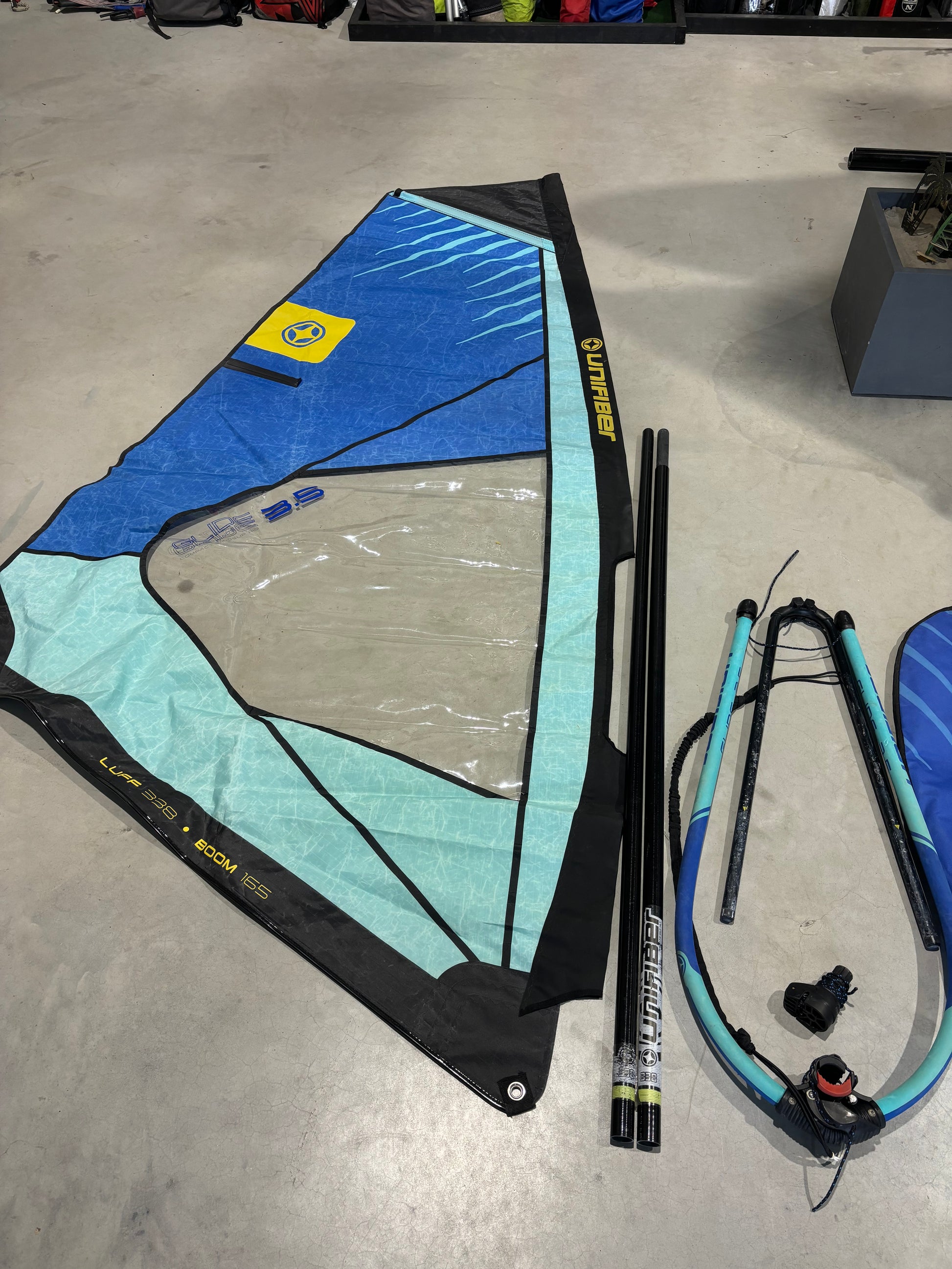Complete Unifiber Gilde 3.5 m² windsurfset, ideaal voor beginnende of jonge windsurfers. De set is in nette staat met normale gebruikssporen.